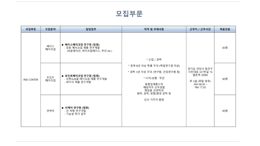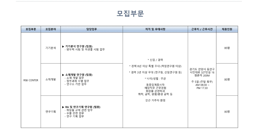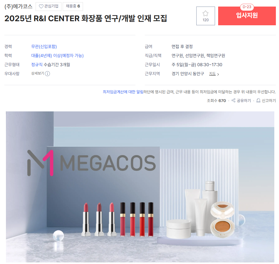 본문 시작 홈으로 커뮤니티 학과소개 학과과정 대학원 커뮤니티 연구동아리 홈페이지가이드 채용정보 학과공지 채용정보 학과일정 포토갤러리 유튜브 인스타그램 취업현황 학생회 조직도 졸업생 숏터뷰 채용정보 페이스북 트위터 프린트 (주)메가코스 2025년 R&I CENTER 화장품 연구/개발 인재 모집 바이오코스메틱학과 조회 : 217 등록일 : 2025-10-24 https://myip.kr/qXQdC 목록 이전[취창업지원처] <위매스> "품질보증" 신입 및 경력 사원 모집공고 전달 및 인재추천 의뢰의 건 다음 아이큐어(주) 화장품 연구소 신입 & 경력직 인재 채용 담당부서 : 바이오코스메틱학과 담당자 : - 연락처 : 043-649-1638 최종수정일 : 2024-10-26 만족도조사 만족도 조사 이 페이지에서 제공하는 정보에 대하여 만족하시나요? 매우만족 만족 보통 불만족 매우불만족