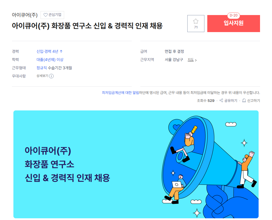본문 시작 홈으로 커뮤니티 학과소개 학과과정 대학원 커뮤니티 연구동아리 홈페이지가이드 채용정보 학과공지 채용정보 학과일정 포토갤러리 유튜브 인스타그램 취업현황 학생회 조직도 졸업생 숏터뷰 채용정보 페이스북 트위터 프린트 아이큐어(주) 화장품 연구소 신입 & 경력직 인재 채용 바이오코스메틱학과 조회 : 214 등록일 : 2025-10-24 https://myip.kr/xRNcs 목록 이전(주)메가코스 2025년 R&I CENTER 화장품 연구/개발 인재 모집 담당부서 : 바이오코스메틱학과 담당자 : - 연락처 : 043-649-1638 최종수정일 : 2024-10-26 만족도조사 만족도 조사 이 페이지에서 제공하는 정보에 대하여 만족하시나요? 매우만족 만족 보통 불만족 매우불만족