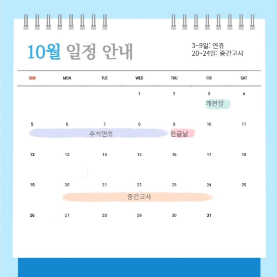 본문 시작 홈으로 커뮤니티 학과소개 입학정보 교과과정 커뮤니티 홈페이지가이드 포토갤러리 SNS 소통 공간 포토갤러리 공지사항 동아리 포토갤러리 페이스북 트위터 프린트 10월 다이어리 항공서비스학과 1155 2025-10-06 안녕하십니까 세명대학교 항공서비스학과 온라인 홍보국 💙푸르미르💙입니다. 10월에는 추석연휴와 중간고사가 있습니다! 확인하시고 일정에 착오 없으시길 바라겠습니다 😊 즐거운 연휴 보내세요🙇♂️ 소중한 꿈을 품고 그 누구보다 높이 오를 여러분을 저희 "푸르미르" 가 항상 응원하겠습니다 ✈💙 궁금한 사항이 있으시다면 언제든지 SNS로 연락 주십시오 💬 #세명대학교 #항공서비스학과 #세명대 #항공과 #푸르미르 #다이어리 목록 다음 제주항공 에듀윙 Advanced class 다음 가을 맞이 일상 사진