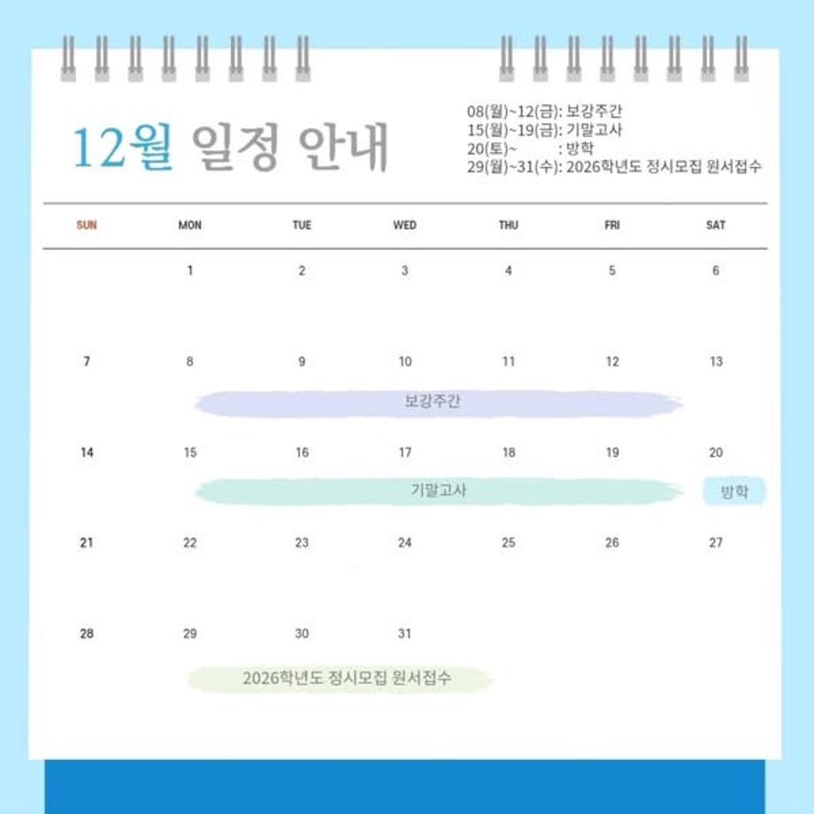 본문 시작 홈으로 커뮤니티 학과소개 입학정보 교과과정 커뮤니티 홈페이지가이드 포토갤러리 SNS 소통 공간 포토갤러리 공지사항 동아리 포토갤러리 페이스북 트위터 프린트 12월 다이어리 항공서비스학과 385 2025-12-02 안녕하십니까 세명대학교 항공서비스학과 온라인 홍보국 💙푸르미르💙입니다. 12월에는 기말고사와 2026학년도 정시모집 원서접수가 있습니다! 확인하시고 일정에 착오 없으시길 바라겠습니다 😊 소중한 꿈을 품고 그 누구보다 높이 오를 여러분을 저희 "푸르미르" 가 항상 응원하겠습니다 ✈💙 궁금한 사항이 있으시다면 언제든지 SNS로 연락 주십시오 💬 #세명대학교 #항공서비스학과 #세명대 목록 이전세명대학교 편의시설 안내 다음 말레이시아 비자 발급