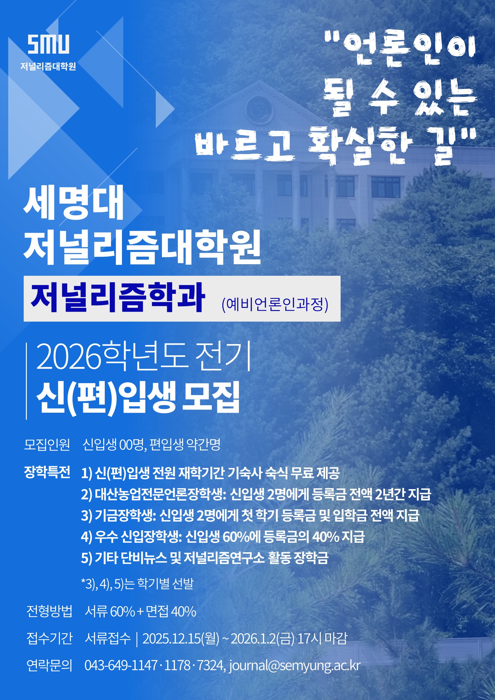 ‘정의롭고 실력 있는 언론인’을 키우는 세명대 저널리즘대학원이 2026년 봄학기에 입학할 저널리즘학과(예비언론인 과정) 신입생과 편입생을 모집합니다. 해마다 전기와 후기로 나눠 시행하는 입시 가운데 이번 전기 모집에서는 기자·PD 지망 신입생 00명, 편입생 약간 명을 선발합니다. 2008년 개교 이후 매년 소수정예를 뽑아 집중·몰입 교육을 해 온 우리 대학원은 지난 17년 동안 전국의 신문·방송사와 관련 업계, 공공부문 등에 370여 명의 인재를 진출시켰습니다. 졸업생들은 뛰어난 실무능력, 날카로운 문제의식, 멀티미디어 역량을 갖춘 언론인·지식인으로서 시대적 과제를 드러내고 대안을 탐색하는 일에 앞장서고 있습니다.