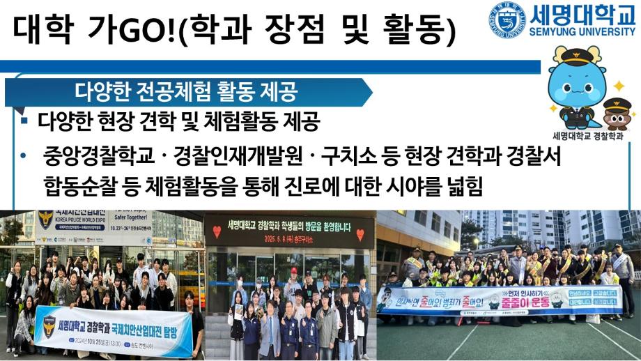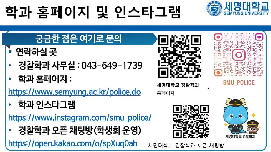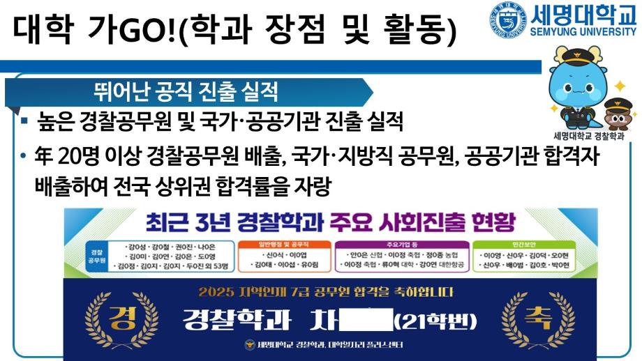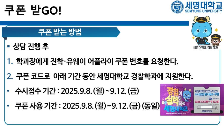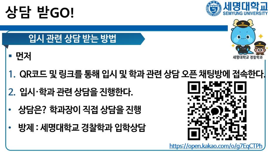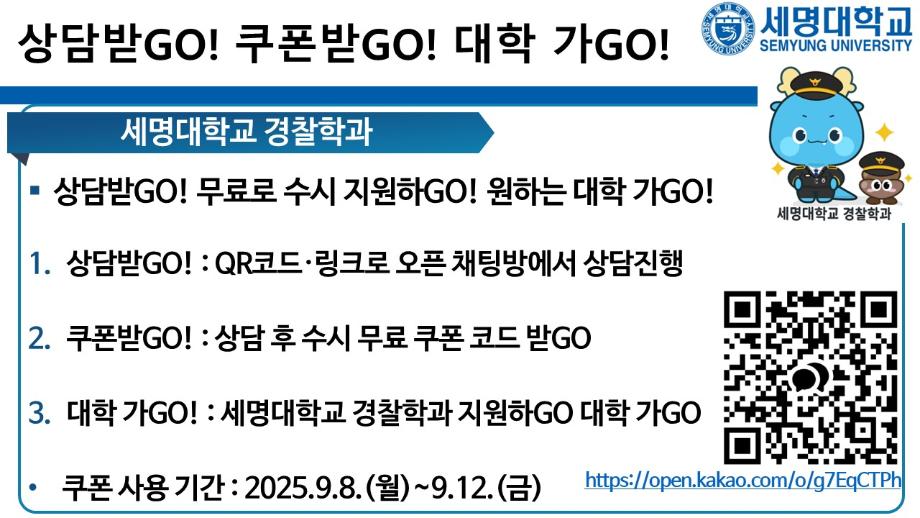 본문 시작 홈으로 커뮤니티 학과소개 교수소개 학과과정 커뮤니티 홈페이지가이드 포토갤러리 학부공지 학과일정 포토갤러리 학생회 동아리 포토갤러리 페이스북 트위터 프린트 상담받고GO! 쿠폰받GO! 무료로 대학 지원하GO! 경찰학과 878 2025-09-05 세명대학교 경찰학과 2026학년도 수시 지원 상담받GO! 쿠폰 받GO! 무료로 대학 지원하GO! 상담받GO! : 먼저 QR코드·링크로 오픈 채팅방에서 상담받GO 쿠폰받GO! : 상담 후 수시 무료 쿠폰 코드 받GO 무료로 대학지원하GO! : 세명대학교 경찰학과 지원하GO 사용처 : 진학어플라이, 유웨이어플라이 쿠폰 사용 기간 : 2025.9.8.(월)~9.12.(금) 세명대학교 경찰학과 2026학년도 수시 모집에 많은 관심 부탁드립니다. 목록 이전2025학년도 하계 방학 중 본교 편의시설 운영 안내 다음 해외 취업사기 범죄예방교육 만족도조사 만족도 조사 이 페이지에서 제공하는 정보에 대하여 만족하시나요? 매우만족 만족 보통 불만족 매우불만족