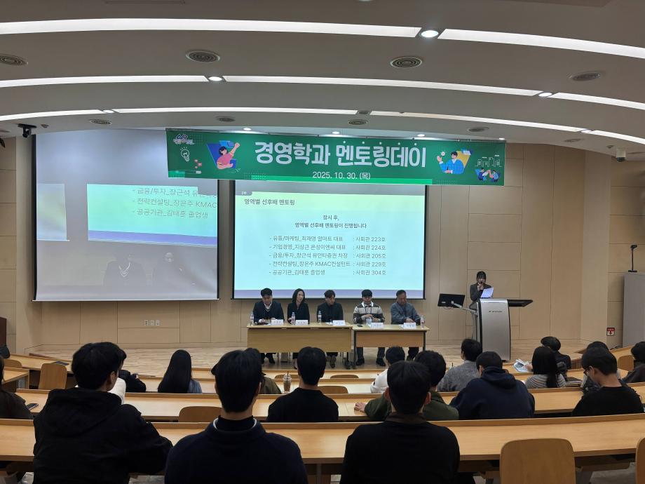 본문 시작 홈으로 커뮤니티 학과소개 학생진로 교과과정 커뮤니티 학과 SNS 홈페이지가이드 학과 갤러리 공지사항 대학원 학과 갤러리 학과 이야기 동아리 학생회 학과 갤러리 페이스북 트위터 프린트 [경영학과] 멘토링데이 행사 경영학과 434 2025-11-03 10월 30일(목) 17시, 학술관 102호에서 경영학과 멘토링데이가 개최되었습니다. 1부에서는 맞춤형 진로/직무 멘토링이, 2부에서는 멘토-멘티 간 자유로운 교류 및 1:1 멘토링, 저녁 식사가 진행되었습니다. 이번 멘토링데이를 통해 학생들이 진로에 대한 이해와 자기주도적 성장 의지를 높일 수 있는 시간이었습니다. 참여해 주신 모든 멘토 멘티 여러분, 수고 많으셨습니다! 목록 이전[일반대학원 경영학과] 논문 발표 및 논문심사 담당부서 : 경영학과 담당자 : - 연락처 : 043-649-1766 최종수정일 : 2024-10-26 만족도조사 만족도 조사 이 페이지에서 제공하는 정보에 대하여 만족하시나요? 매우만족 만족 보통 불만족 매우불만족