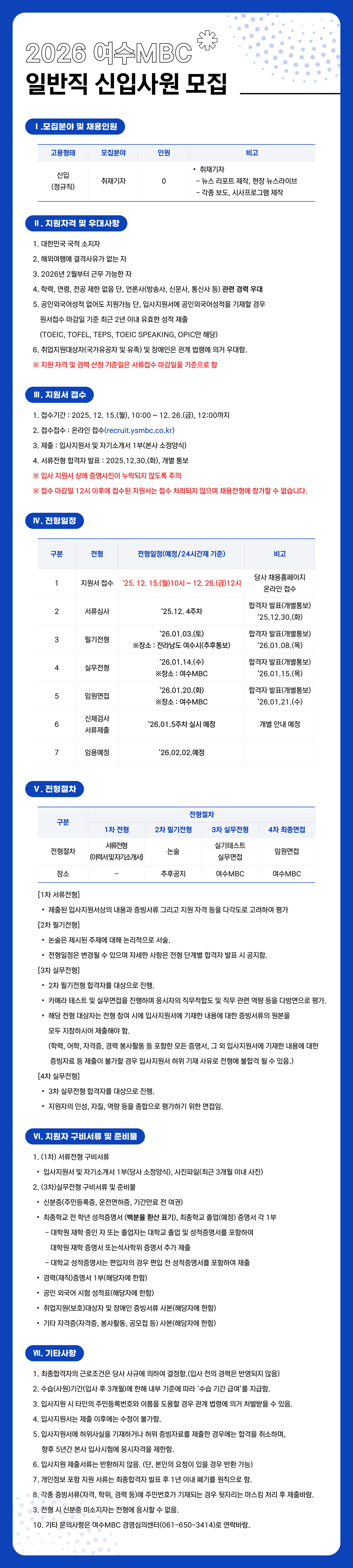 본문 시작 게시판 대학원소개 교수/학생소개 교과과정 입학/학사안내 공지사항 게시판 저널리즘연구소 홈페이지가이드 언론사 채용공고 단비뉴스 편집실 단비서재 세저리 이야기 언론사 채용공고 언론계 동향 언시 후기 사진첩 언론 현장에서 언론사 채용공고 페이스북 트위터 프린트 (~12/26) 여수MBC 신입기자 공개채용 저널리즘대학원 조회 : 132 등록일 : 2025-12-12 지원하러 가기 목록 이전(~12/28) 옥천신문 신입기자 공개채용