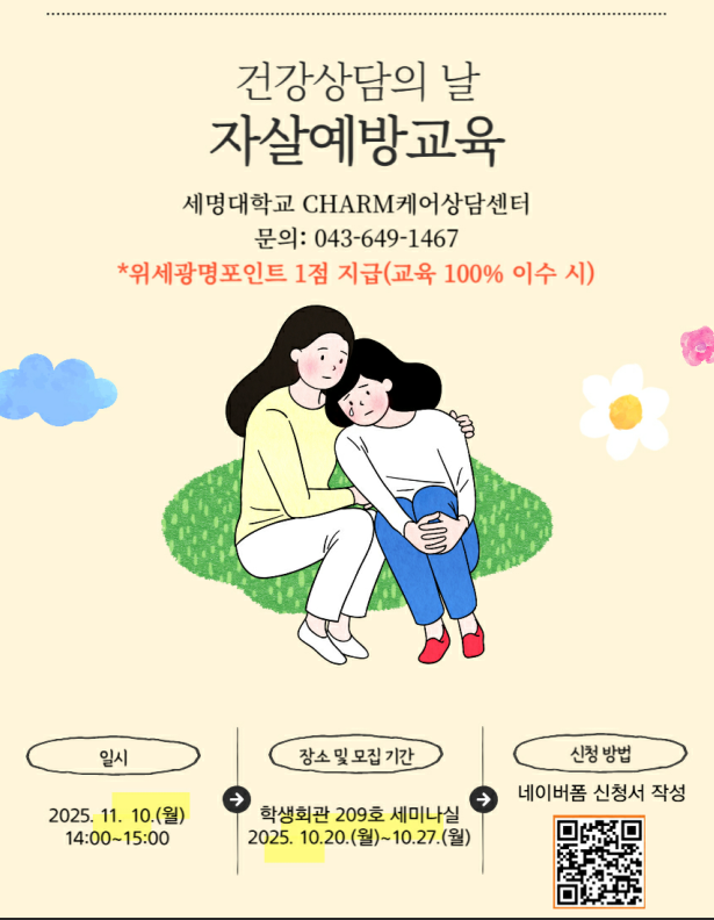 본문 시작 홈으로 학과생활 학과소개 교수소개 교과과정 학과생활 홈페이지가이드 사진게시판 공지사항 사진게시판 전공자료실 동아리 학과행사 사진게시판 페이스북 트위터 프린트 [CHARM케어상담센터] 2025학년도 2학기 자살예방교육 진행 안내 산업디자인학과 137 2025-10-21 목록 이전[긴급공지] 최근 급증 중인 '캄보디아 불법 고용, 납치' 사례 주의 안내 다음 [CHARM케어상담센터] 2025학년도 2학기 알코올중독 예방 및 스트레스 대처 관련 교육 진행 안내 담당부서 : 산업디자인학과 담당자 : - 연락처 : 043-649-1436 최종수정일 : 2024-10-26 만족도조사 만족도 조사 이 페이지에서 제공하는 정보에 대하여 만족하시나요? 매우만족 만족 보통 불만족 매우불만족