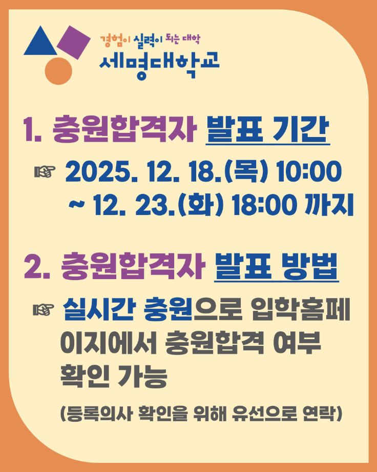 본문 시작 홈으로 학과생활 학과소개 교수소개 교과과정 학과생활 홈페이지가이드 사진게시판 공지사항 사진게시판 전공자료실 동아리 학과행사 사진게시판 페이스북 트위터 프린트 [수시모집] 2026학년도 수시모집 충원합격자 발표안내 산업디자인학과 50 2025-12-18 목록 이전[수시모집] 2026학년도 수시모집 최초합격자 등록안내 담당부서 : 산업디자인학과 담당자 : - 연락처 : 043-649-1436 최종수정일 : 2024-10-26 만족도조사 만족도 조사 이 페이지에서 제공하는 정보에 대하여 만족하시나요? 매우만족 만족 보통 불만족 매우불만족