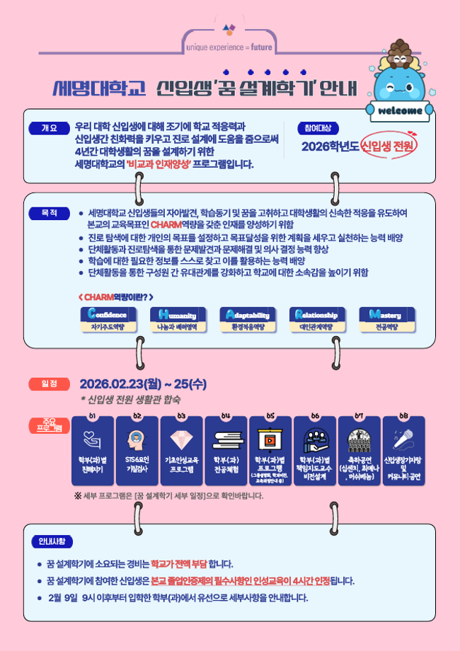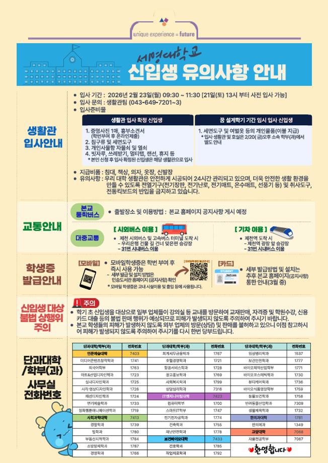본문 시작 홈으로 학과생활 학과소개 교수소개 교과과정 학과생활 홈페이지가이드 사진게시판 공지사항 사진게시판 전공자료실 동아리 학과행사 사진게시판 페이스북 트위터 프린트 [학생처] 2026학년도 신입생 '꿈 설계학기(오리엔테이션)' 시행 산업디자인학과 18 2026-02-04 목록 이전다이소 세명대점 오픈(2/19) 안내 담당부서 : 산업디자인학과 담당자 : - 연락처 : 043-649-1436 최종수정일 : 2024-10-26 만족도조사 만족도 조사 이 페이지에서 제공하는 정보에 대하여 만족하시나요? 매우만족 만족 보통 불만족 매우불만족