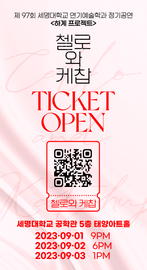 본문 시작 홈으로 커뮤니티 학과소개 입학정보 교수소개 학과과정 커뮤니티 공연예매 안내 홈페이지가이드 포토갤러리 공지사항 포토갤러리 작품DB 동아리 학사일정 학생회 포토갤러리 페이스북 트위터 프린트 제 97회 세명대학교 연기예술학과 정기공연 '하계 프로젝트' < 첼로와 케찹 > 연기예술학과 3695 2023-08-24 제 97회 세명대학교 연기예술학과 정기공연 '하계 프로젝트' < 첼로와 케찹 > 캐릭터 포스터 입니다. 𝑪𝒆𝒍𝒍𝒐 𝒂𝒏𝒅 𝑲𝒆𝒕𝒄𝒉𝒖𝒑 𝟐𝟎𝟐𝟑•𝟎𝟗•𝟎𝟏 𝟗𝐏𝐌 𝟐𝟎𝟐𝟑•𝟎𝟗•𝟎𝟐 𝟔𝐏𝐌 𝟐𝟎𝟐𝟑•𝟎𝟗•𝟎𝟑 𝟏𝐏𝐌 세명대학교 공학관 5층 태양아트홀 - 2023.08.19 - 2023.09.11 첫 번째 작품 | d0nut 두 번째 작품 | 첼로와 케찹 세 번째 작품 | 하녀들 여러분들의 많은 관심과 참여 부탁드립니다. 목록 이전사이와의 인터뷰 - 23년도 무대장 ‘장보배‘ 다음 제5회 세명진로 Festival 개최 안내 담당부서 : 연기예술학과 담당자 : - 연락처 : 043-649-1733 최종수정일 : 2024-10-26 만족도조사 만족도 조사 이 페이지에서 제공하는 정보에 대하여 만족하시나요? 매우만족 만족 보통 불만족 매우불만족