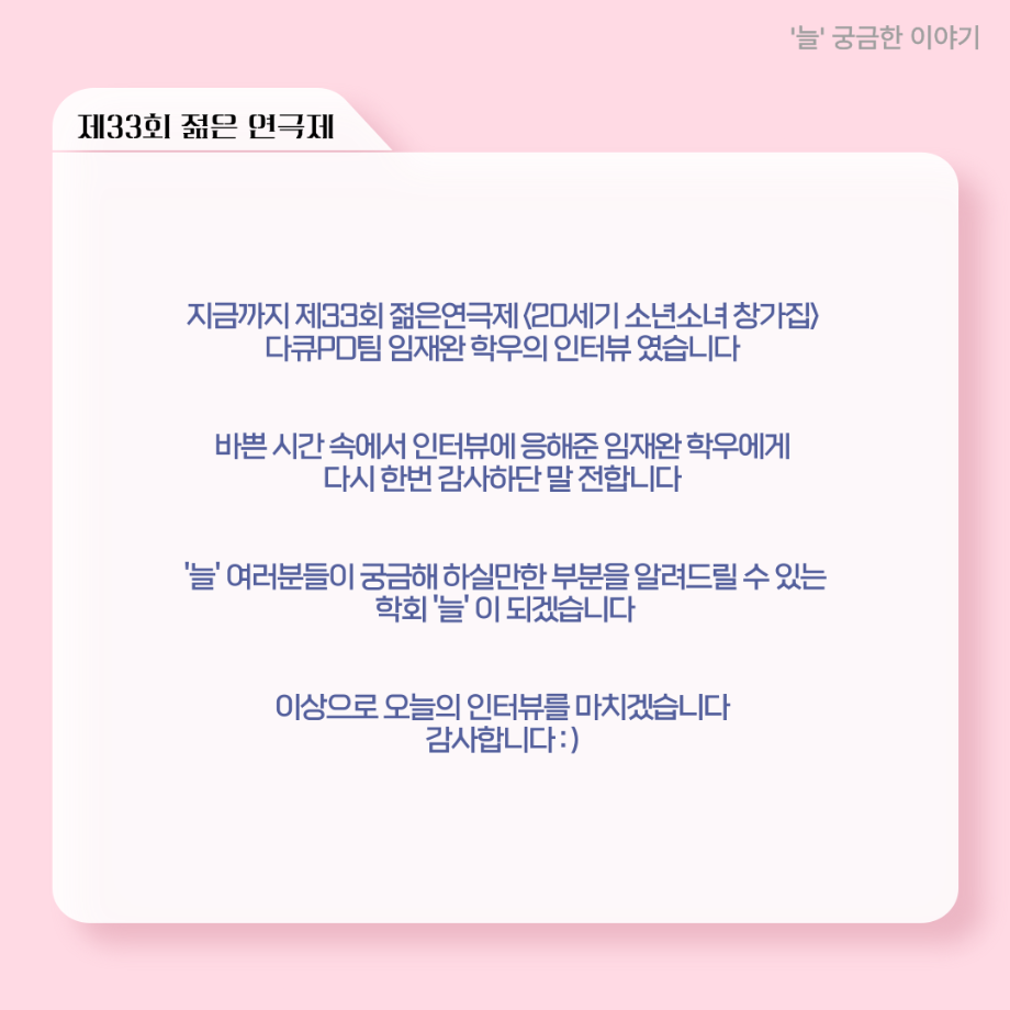 본문 시작 홈으로 커뮤니티 학과소개 입학정보 교수소개 학과과정 커뮤니티 공연예매 안내 홈페이지가이드 포토갤러리 공지사항 포토갤러리 작품DB 동아리 학사일정 학생회 포토갤러리 페이스북 트위터 프린트 ‘늘‘ 궁금한 이야기 - 젊은연극제 ‘20세기 소년소녀 창가집’ 다큐pd 役 < 임재완 > 연기예술학과 672 2025-09-12 . 목록 이전‘늘‘ 궁금한 이야기 - 젊은연극제 ‘20세기 소년소녀 창가집’ 종이연극 아저씨 役 < 윤준호 > 다음 ‘늘‘ 궁금한 이야기 - 현장실습 < 이종서 > 담당부서 : 연기예술학과 담당자 : - 연락처 : 043-649-1733 최종수정일 : 2024-10-26 만족도조사 만족도 조사 이 페이지에서 제공하는 정보에 대하여 만족하시나요? 매우만족 만족 보통 불만족 매우불만족