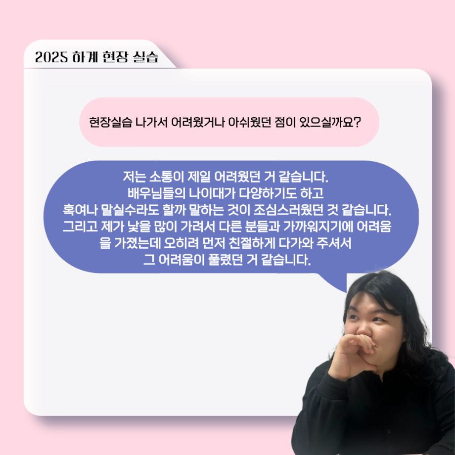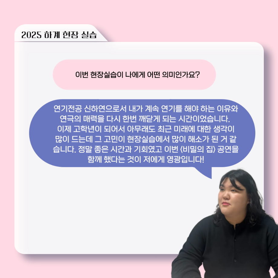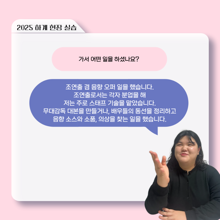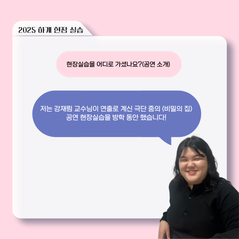 본문 시작 홈으로 커뮤니티 학과소개 입학정보 교수소개 학과과정 커뮤니티 공연예매 안내 홈페이지가이드 포토갤러리 공지사항 포토갤러리 작품DB 동아리 학사일정 학생회 포토갤러리 페이스북 트위터 프린트 ‘늘‘ 궁금한 이야기 - 현장실습 < 신하연 > 연기예술학과 493 2025-10-16 . 목록 이전117회 세명대학교 연기예술학과 하계프로젝트 사랑의 온도 배우 소개 다음 ‘늘‘ 궁금한 이야기 - 하계 프로젝트 ‘컨택’팀 고진役 < 조진석 > 담당부서 : 연기예술학과 담당자 : - 연락처 : 043-649-1733 최종수정일 : 2024-10-26 만족도조사 만족도 조사 이 페이지에서 제공하는 정보에 대하여 만족하시나요? 매우만족 만족 보통 불만족 매우불만족