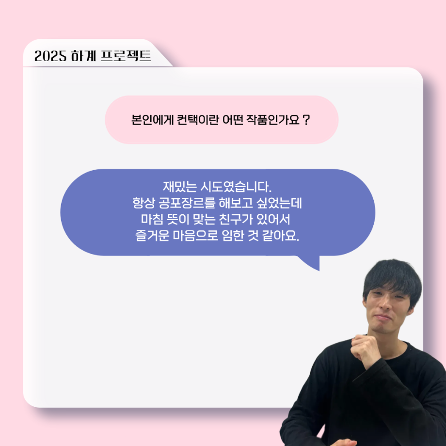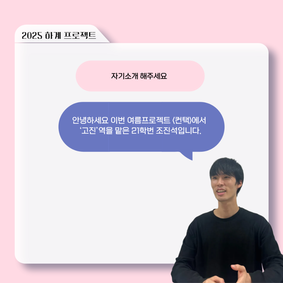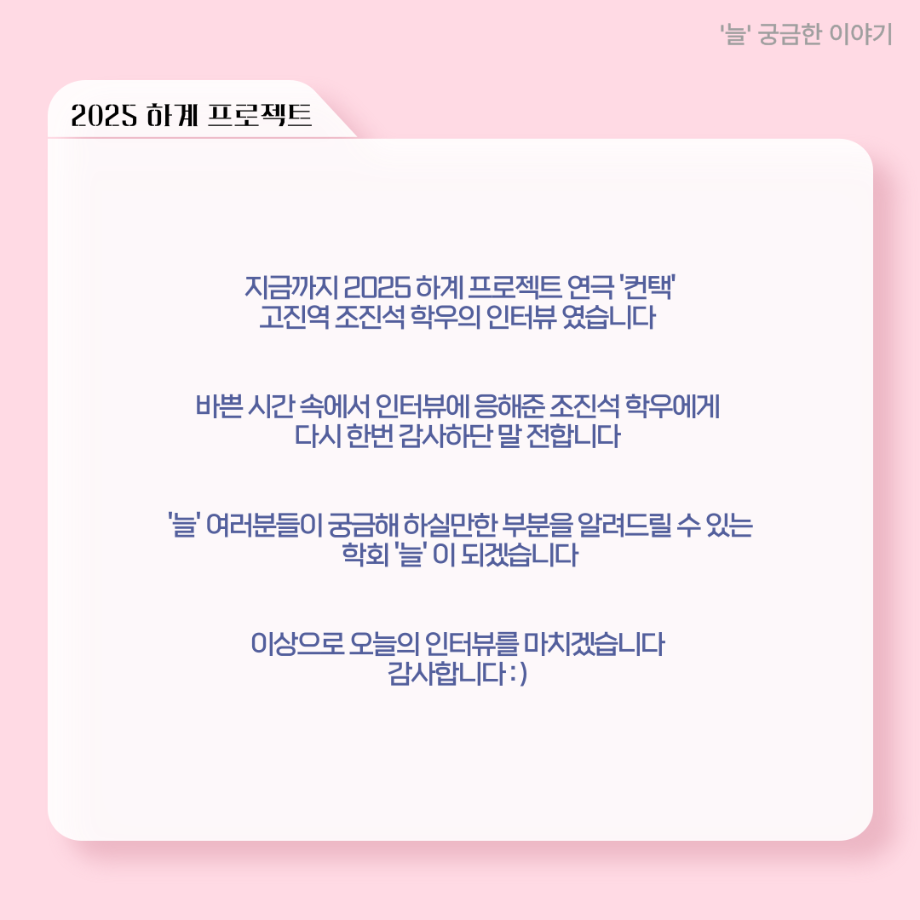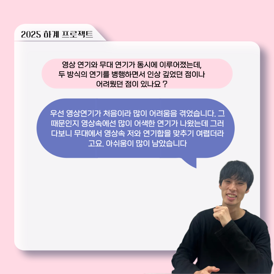 본문 시작 홈으로 커뮤니티 학과소개 입학정보 교수소개 학과과정 커뮤니티 공연예매 안내 홈페이지가이드 포토갤러리 공지사항 포토갤러리 작품DB 동아리 학사일정 학생회 포토갤러리 페이스북 트위터 프린트 ‘늘‘ 궁금한 이야기 - 하계 프로젝트 ‘컨택’팀 고진役 < 조진석 > 연기예술학과 1321 2025-10-31 . 목록 이전‘늘‘ 궁금한 이야기 - 현장실습 < 신하연 > 다음 세명대학교 연기예술학과 과체전 담당부서 : 연기예술학과 담당자 : - 연락처 : 043-649-1733 최종수정일 : 2024-10-26 만족도조사 만족도 조사 이 페이지에서 제공하는 정보에 대하여 만족하시나요? 매우만족 만족 보통 불만족 매우불만족