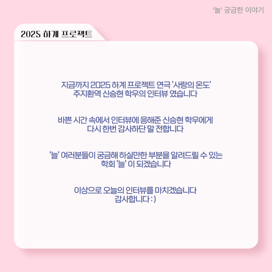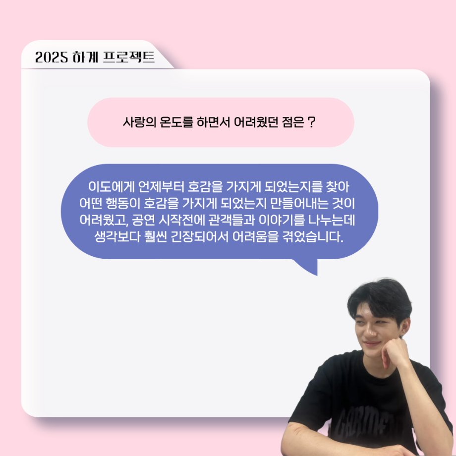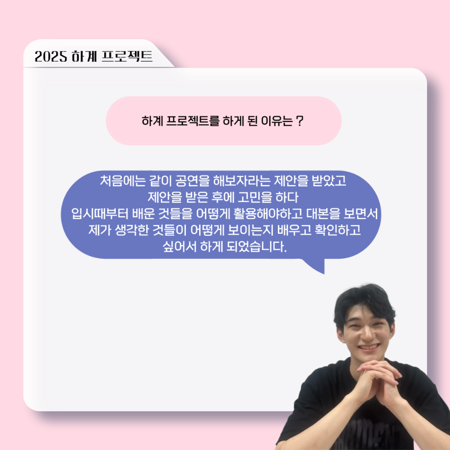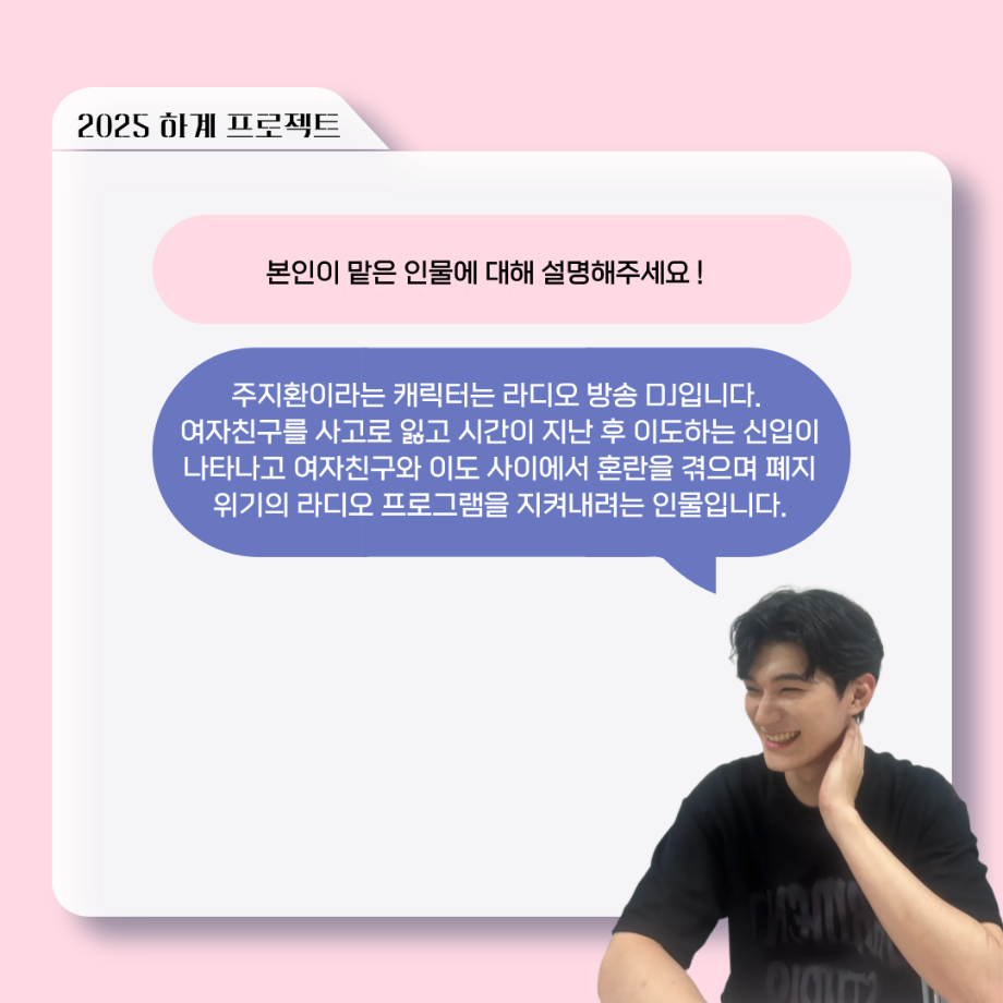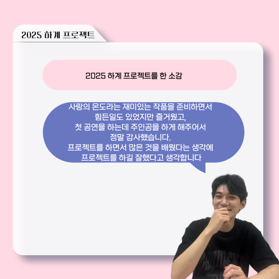 본문 시작 홈으로 커뮤니티 학과소개 입학정보 교수소개 학과과정 커뮤니티 공연예매 안내 홈페이지가이드 포토갤러리 공지사항 포토갤러리 작품DB 동아리 학사일정 학생회 포토갤러리 페이스북 트위터 프린트 ‘늘‘ 궁금한 이야기 - 하계 프로젝트 ‘사랑의 온도’팀 주지환役 < 신승현 > 연기예술학과 241 2025-11-11 . 목록 이전‘늘‘ 궁금한 이야기 - 하계 프로젝트 ‘사랑의 온도’팀 서이도役 < 함유진 > 다음 ‘늘‘ 궁금한 이야기 - 2025 졸업작품 ‘유랑극장’ 노풍찬役 < 김은혁 > 담당부서 : 연기예술학과 담당자 : - 연락처 : 043-649-1733 최종수정일 : 2024-10-26 만족도조사 만족도 조사 이 페이지에서 제공하는 정보에 대하여 만족하시나요? 매우만족 만족 보통 불만족 매우불만족