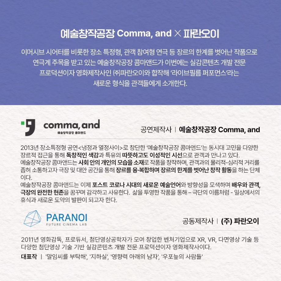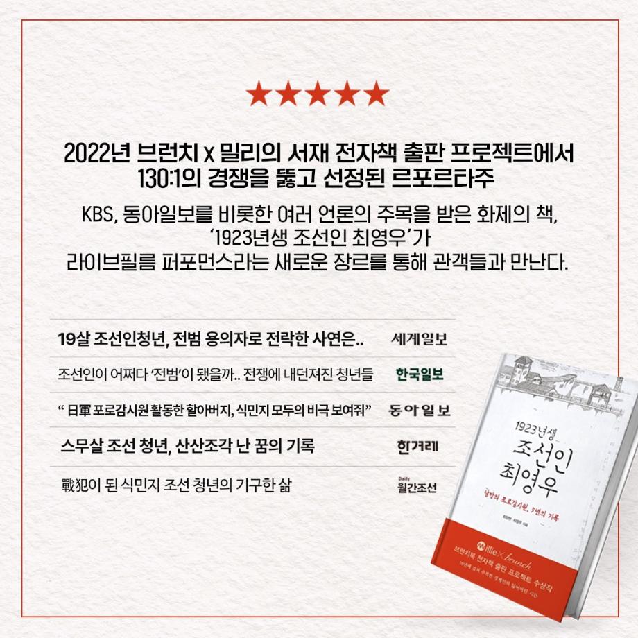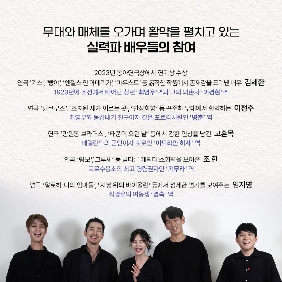 본문 시작 홈으로 커뮤니티 학과소개 입학정보 교수소개 학과과정 커뮤니티 공연예매 안내 홈페이지가이드 포토갤러리 공지사항 포토갤러리 작품DB 동아리 학사일정 학생회 포토갤러리 페이스북 트위터 프린트 이지은 교수님 연출작품 <1923년생 조선인 최영우> 연기예술학과 3141 2023-07-11 이지은(이태린) 교수님이 연출하신 <1923년생 조선인 최영우>가 2023년 한국문화예술위원회 예술과 기술융합 지원사업에 선정되어 이번에 공연을 올립니다. 2023.07.14. - 07.16 금 20:00 / 토 15:00, 19:00 / 일 15:00 동국대 이해랑예술극장 출연 : 김세환, 이정주, 고훈목, 조한, 임지영 극작 : 최양현 / 연출 : 이태린 주최/주관 예술창작공장 콤마앤드 @commaand2013 많은 관심 부탁드립니다. 목록 이전사이와의 인터뷰 - 23년도 조명장 ‘김은경‘ 다음 2023학년도 2학기 표준현장실습 학생신청 안내 담당부서 : 연기예술학과 담당자 : - 연락처 : 043-649-1733 최종수정일 : 2024-10-26 만족도조사 만족도 조사 이 페이지에서 제공하는 정보에 대하여 만족하시나요? 매우만족 만족 보통 불만족 매우불만족