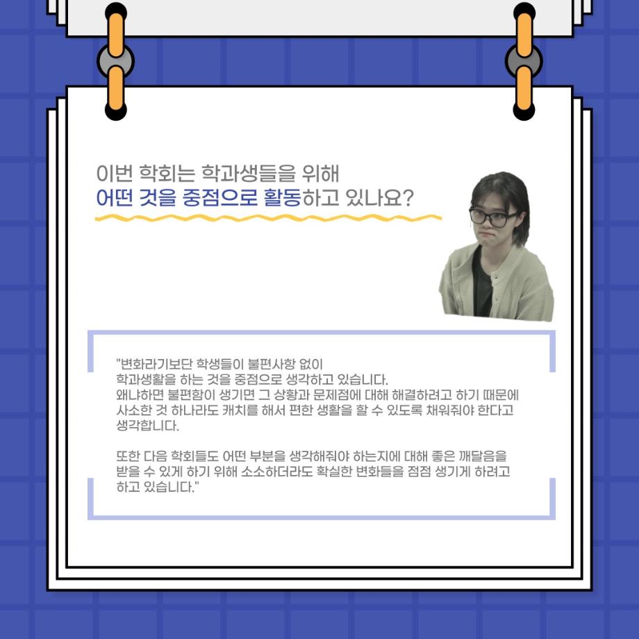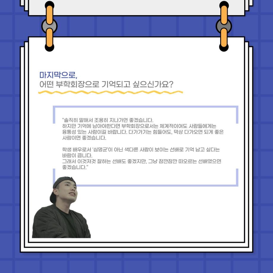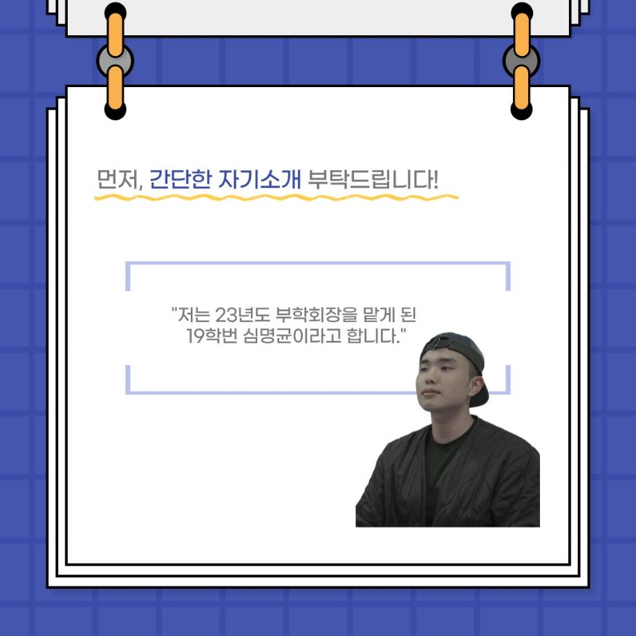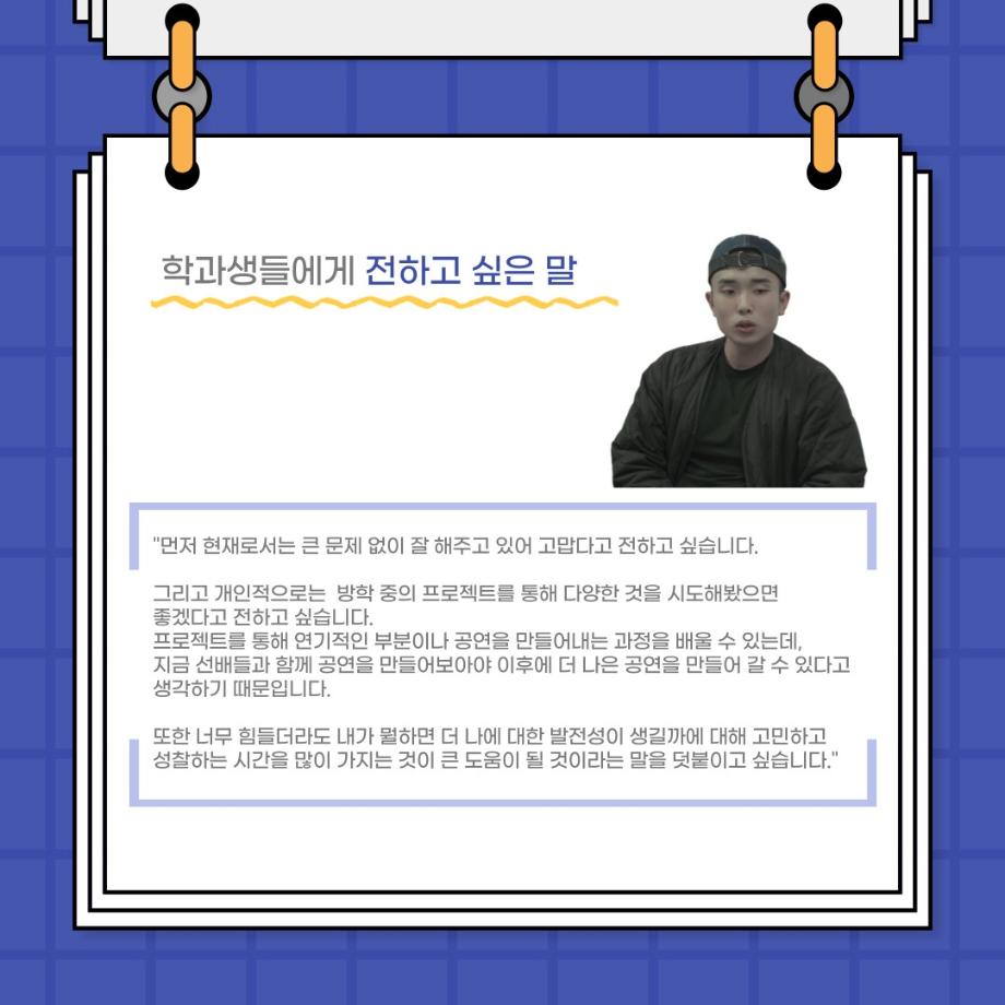 본문 시작 홈으로 커뮤니티 학과소개 입학정보 교수소개 학과과정 커뮤니티 공연예매 안내 홈페이지가이드 포토갤러리 공지사항 포토갤러리 작품DB 동아리 학사일정 학생회 포토갤러리 페이스북 트위터 프린트 사이와의 인터뷰 - 23년도 부학회장 ‘심명균’ 연기예술학과 2973 2023-06-07 안녕하십니까. 23년도 학회 ‘사이’입니다! 학회 ‘사이’의 두번째 인터뷰로 연기예술학과 23년도 부학회장인 심명균 부학회장과 인터뷰하는 시간을 가졌습니다. 학회를 맡은 소감과 부학회장이 되기로 결심한 계기, 학과생들에게 전하고 싶은 말 등 다양한 인터뷰를 진행하였습니다. 다음 인터뷰 컨텐츠 ‘사인’도 많은 사랑 부탁드립니다. 목록 다음 제 97회 세명대학교 연기예술학과 정기공연 '하계 프로젝트' < 첼로와 케찹 > 캐릭터 포스터 다음 사이와의 인터뷰 - 23년도 무대사수 ‘이종화’ 담당부서 : 연기예술학과 담당자 : - 연락처 : 043-649-1733 최종수정일 : 2024-10-26 만족도조사 만족도 조사 이 페이지에서 제공하는 정보에 대하여 만족하시나요? 매우만족 만족 보통 불만족 매우불만족