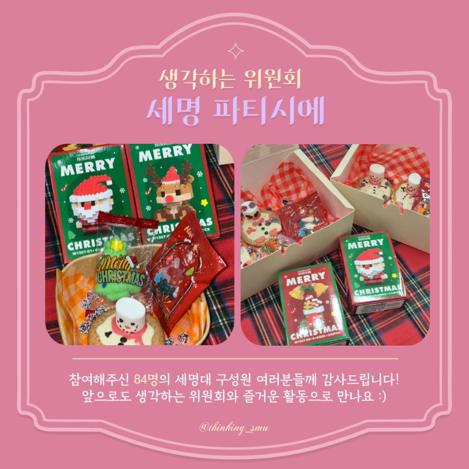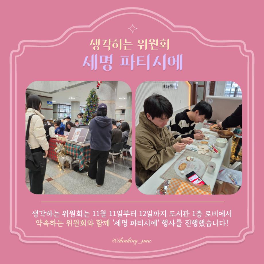 본문 시작 홈으로 포토갤러리 학생위원회 개요 학생위원회 소개 공지사항 활동결과 홈페이지가이드 포토갤러리 페이스북 트위터 프린트 [생각하는 위원회] 학술지원팀 173 2025-11-19 안녕하세요! 재미있는 경험을 위한 학생위원회 '생각하는 위원회'입니다! 생각하는 위원회 행사인 세명 파티시에 활동이 마무리되었습니다👏 [세명 파티시에 행사 결과] 일시 : 2025년 11월 11일(화)~11월 12일(수) 장소 : 도서관 1층 로비 참여자 : 84명 2025년에도 생각하는 위원회의 활동에 많은 관심을 주셔서 감사합니다! 내년에도 재미있는 활동으로 만나요❤️ 목록 이전[약속하는,생각하는 위원회] 세명파티시에 이전[꽃피는 위원회] 북!마크! 해버렸지뭐야 담당부서 : 장학복지팀 담당자 : - 연락처 : 043-649-1142 최종수정일 : 2024-10-26 만족도조사 만족도 조사 이 페이지에서 제공하는 정보에 대하여 만족하시나요? 매우만족 만족 보통 불만족 매우불만족