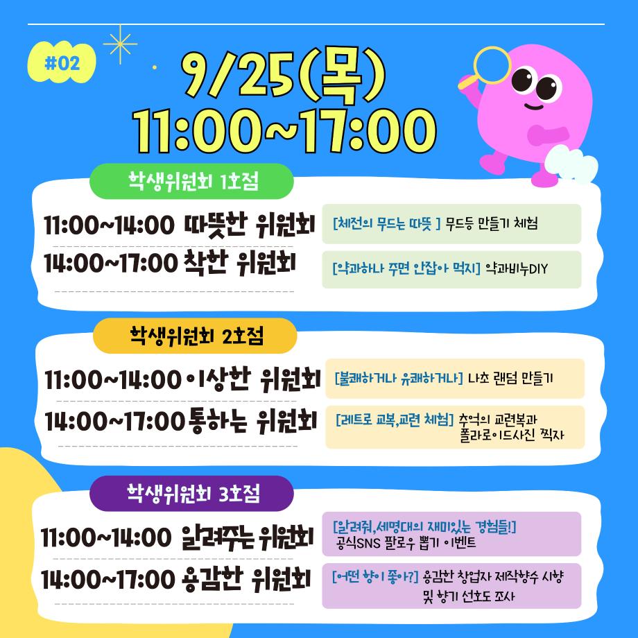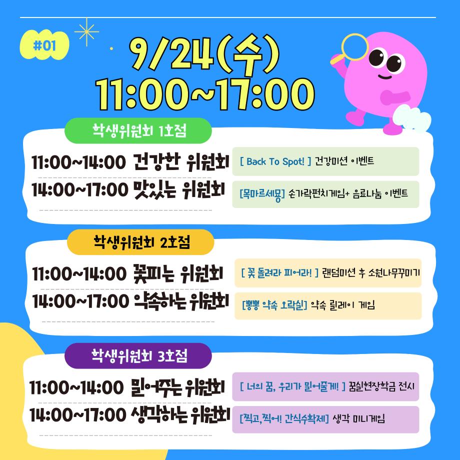 본문 시작 홈으로 공지사항 학생위원회 개요 학생위원회 소개 공지사항 활동결과 홈페이지가이드 프로그램 계획 프로그램 계획 세명대학교 공지사항 프로그램 계획 페이스북 트위터 프린트 [학생위원회] 청룡체전기간 학생위원회 전체활동안내 학생처 169 2025-09-24 청룡체전기간 학생위원회 활동을 아래와 같이 안내드리니 많은 참여 부탁드립니다. 목록 이전[약속하는 위원회]뿅뿅! 약속 오락실! 다음 [꽃피는 위원회] 꽃 돌려라 피어라! 담당부서 : 장학복지팀 담당자 : - 연락처 : 043-649-1142 최종수정일 : 2024-10-26 만족도조사 만족도 조사 이 페이지에서 제공하는 정보에 대하여 만족하시나요? 매우만족 만족 보통 불만족 매우불만족