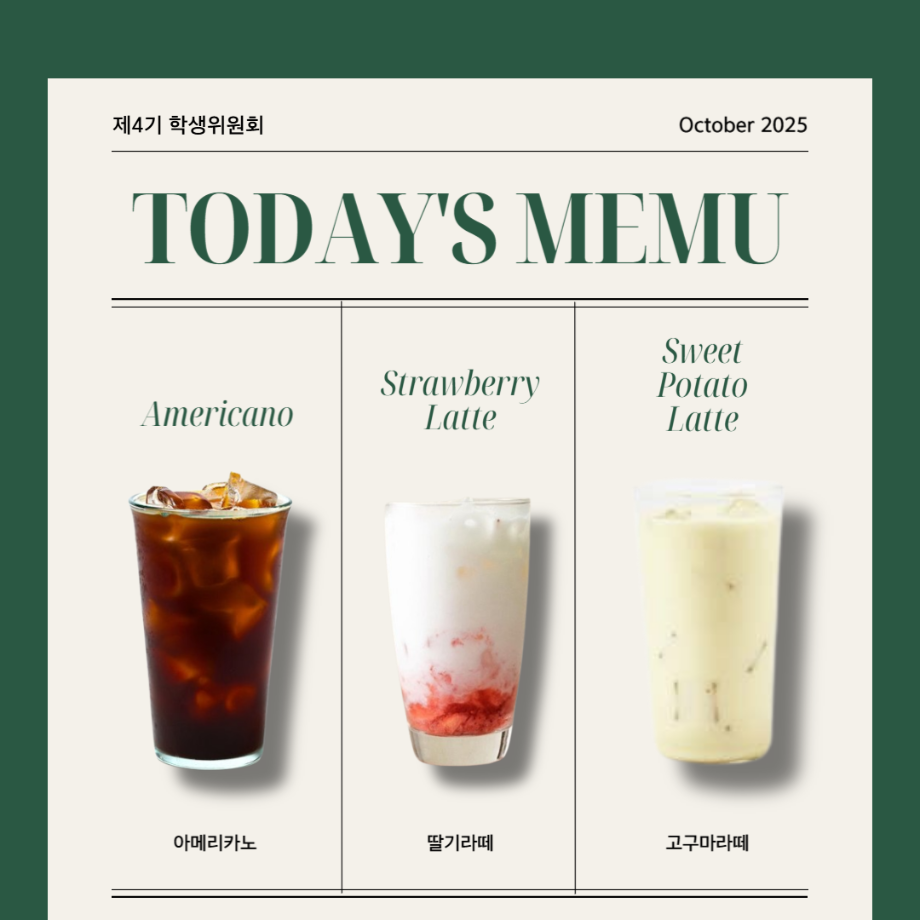 본문 시작 홈으로 공지사항 학생위원회 개요 학생위원회 소개 공지사항 활동결과 홈페이지가이드 프로그램 계획 프로그램 계획 세명대학교 공지사항 프로그램 계획 페이스북 트위터 프린트 [맛있는 위원회] 얼죽아 모임에 초대합니다 학생처 98 2025-11-05 행사명: 얼죽아 모임에 초대합니다 일시: 2025. 11. 05. (수), 12:00~15:00 장소: 세명스퀘어 (학생회관 앞) 내용: 맛있는 위원회 공식 인스타그램 계정 팔로우 후, 음료 수령 음료종류: 아메리카노, 딸기라떼, 고구마라떼 목록 이전[꽃피는 위원회] 북!마크!해버렸지뭐야 다음 [건강한 위원회] 보틀크래시 담당부서 : 장학복지팀 담당자 : - 연락처 : 043-649-1142 최종수정일 : 2024-10-26 만족도조사 만족도 조사 이 페이지에서 제공하는 정보에 대하여 만족하시나요? 매우만족 만족 보통 불만족 매우불만족