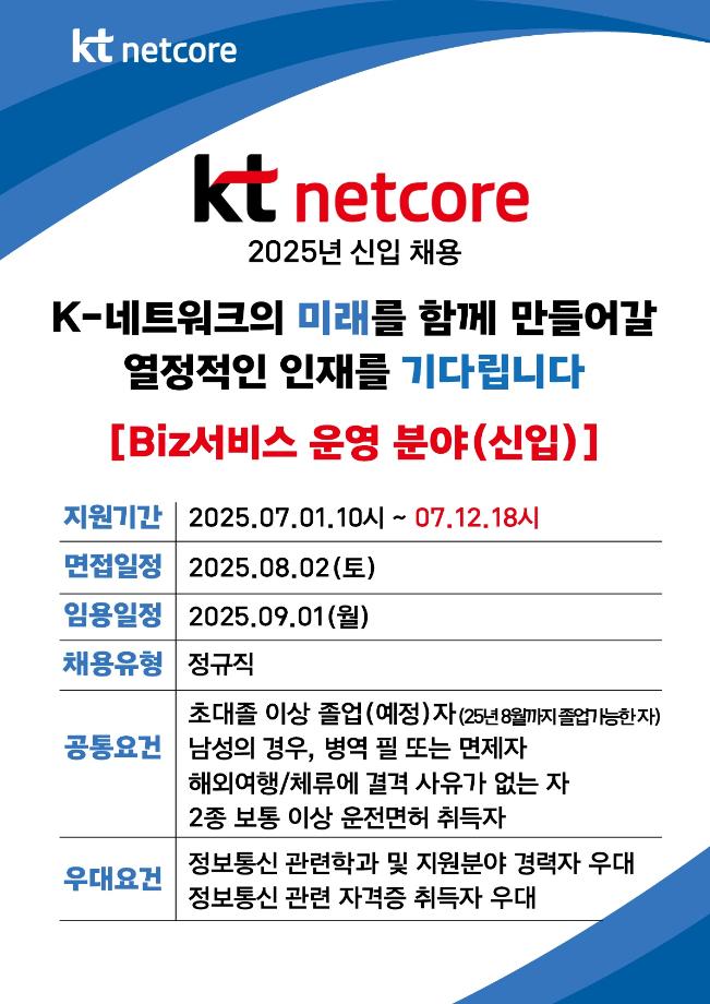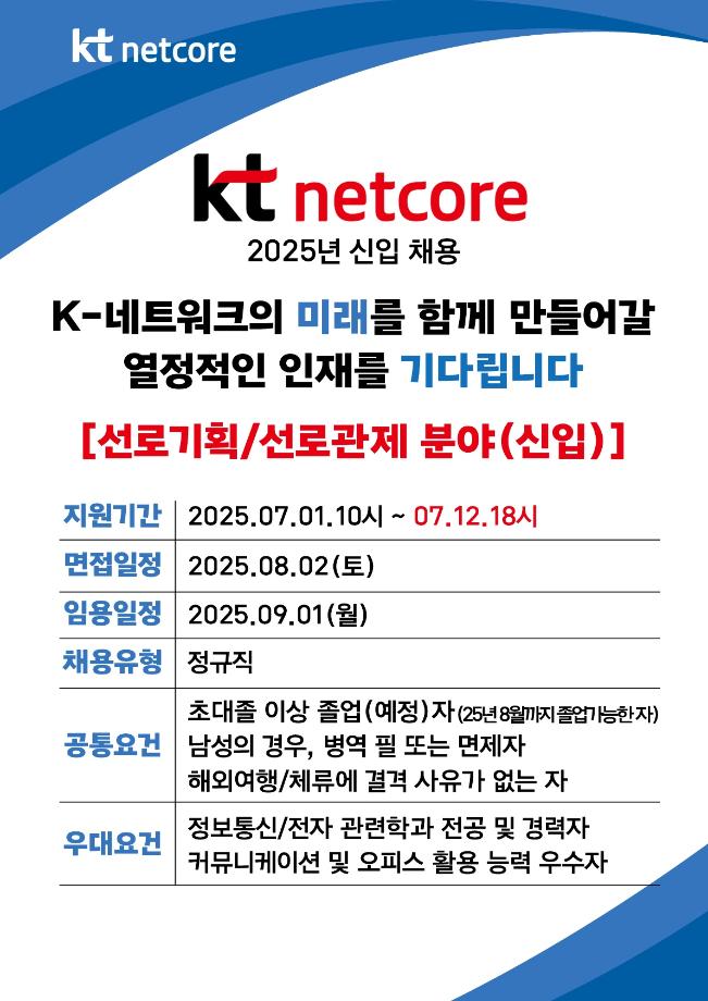 ◈ 지원방법 : https://recruit.kt.com/ KT홈페이지에서 직접 지원