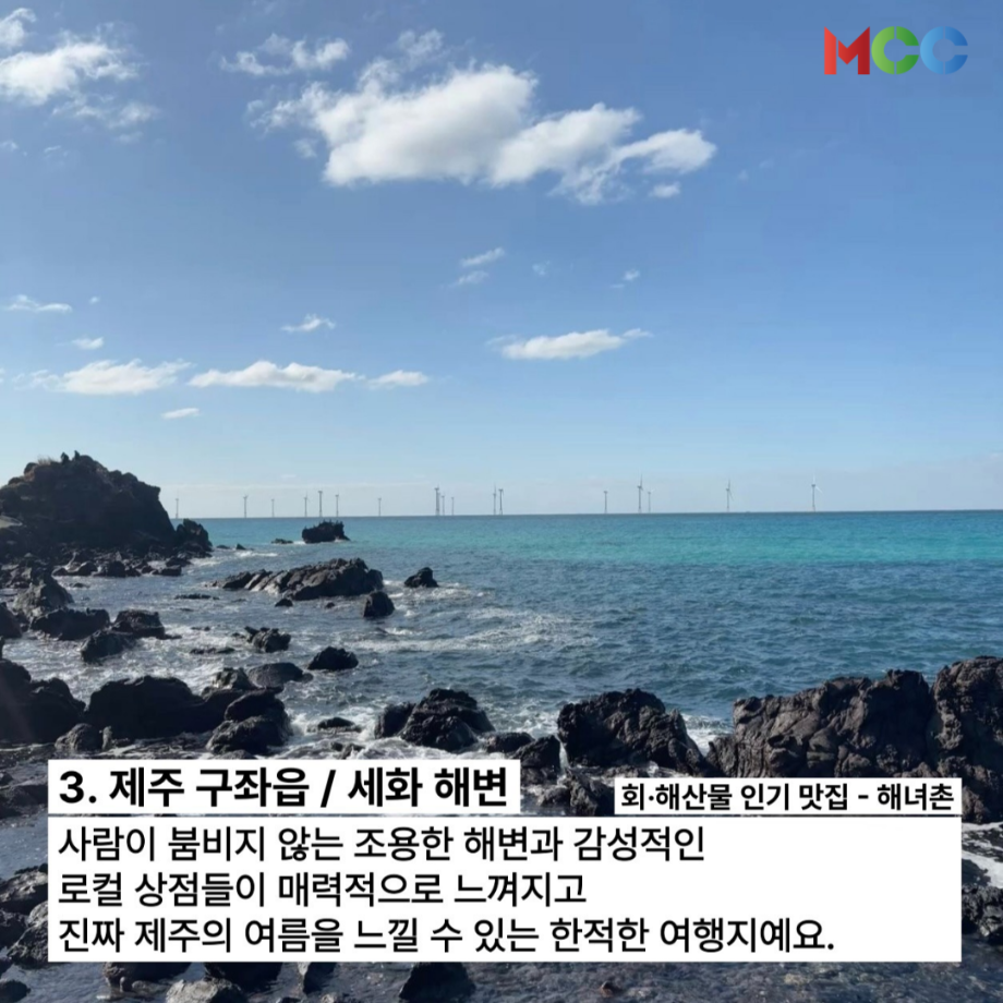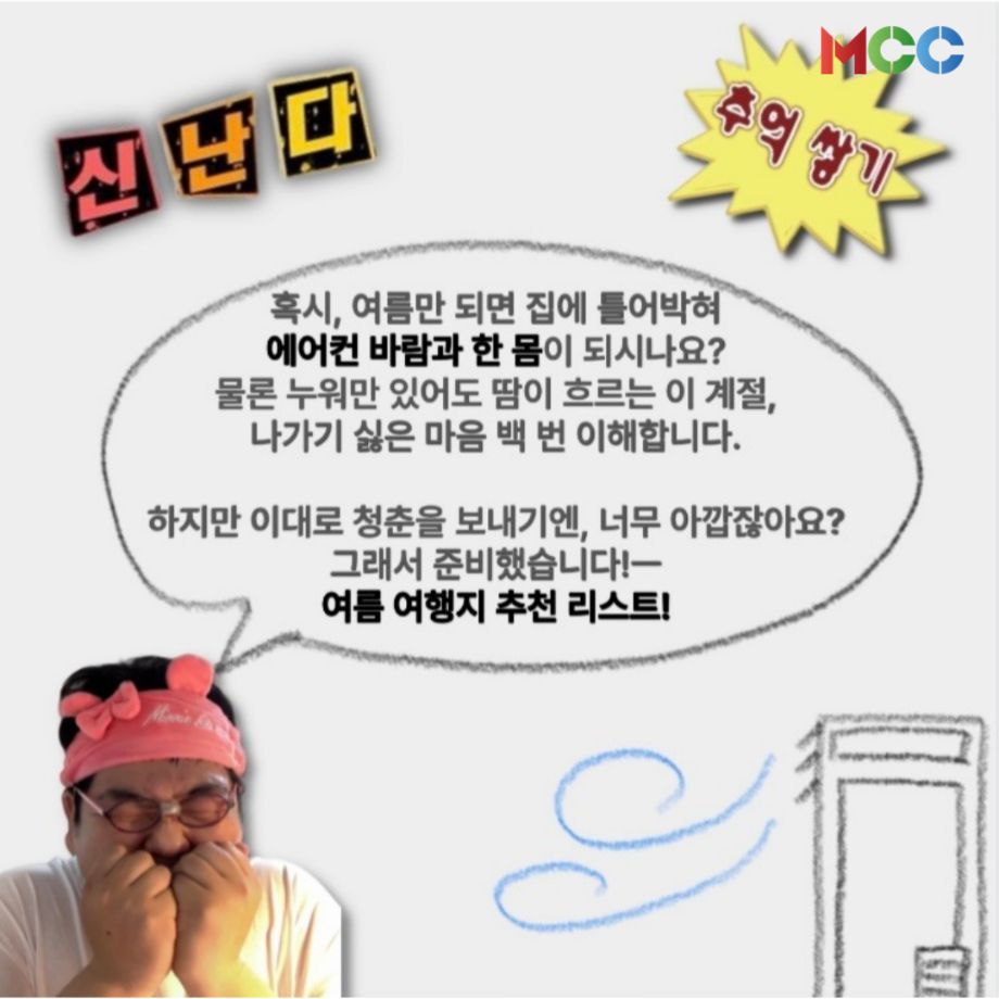 본문 시작 홈으로 MCC News 학과소개 교수소개 학과과정 MCC News MCC SNS 홈페이지가이드 미디어 정보통 학과 및 재학생 교수 및 졸업생 미디어 정보통 미디어 정보통 페이스북 트위터 프린트 여름방학 갈만한 여행지 추천.zip 미디어콘텐츠창작학과 638 2025-07-07 “놀러가고 싶다 격하게..!”😩 🌞여름방학 갈만한 여행지 추천.zip🌞 1.강릉 인목해변 2.통영 욕지도/동피랑마을 3.제주 구좌읍/세화 해변 4.서울 노들섬&한강공원 5.속초 외옹치해변 자세한 내용은 미콘창 인스타그램에서 확인해주세요 @smu_mcc 목록 다음 2025 친환경 에너지 콘텐츠 공모전 다음 미디어콘텐츠창작학과 궁금해?! 담당부서 : 미디어콘텐츠창작학과 담당자 : - 연락처 : 043-649-1741 최종수정일 : 2024-10-26 만족도조사 만족도 조사 이 페이지에서 제공하는 정보에 대하여 만족하시나요? 매우만족 만족 보통 불만족 매우불만족
