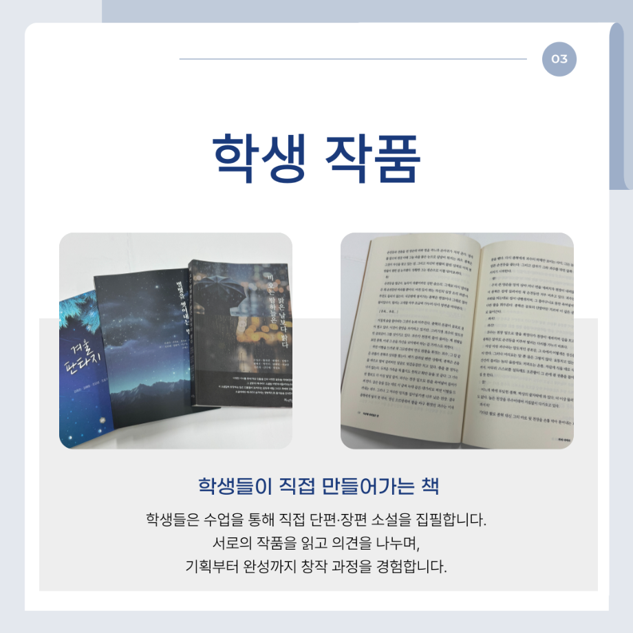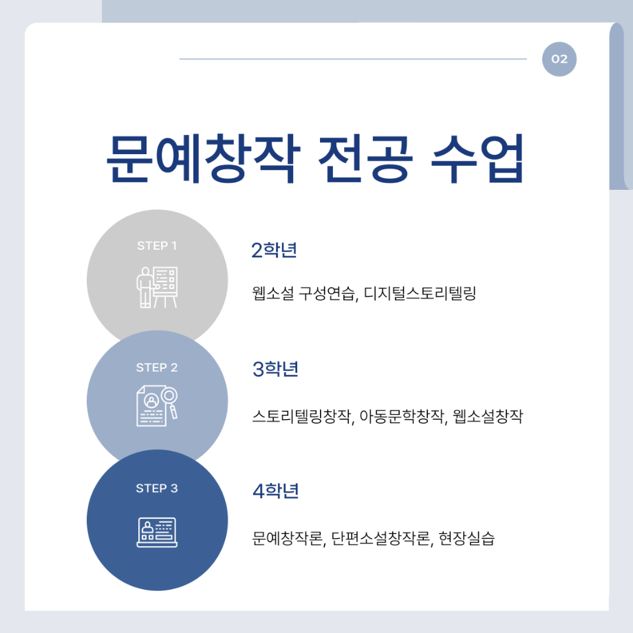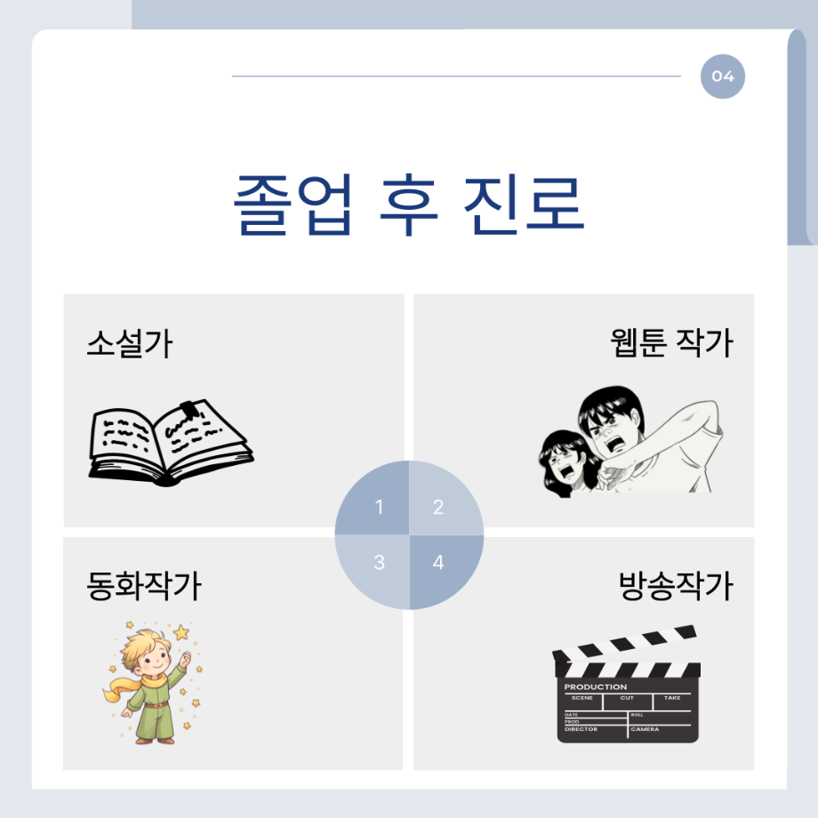 본문 시작 홈으로 MCC News 학과소개 교수소개 학과과정 MCC News MCC SNS 홈페이지가이드 미디어 정보통 학과 및 재학생 교수 및 졸업생 미디어 정보통 미디어 정보통 페이스북 트위터 프린트 📖 미디어콘텐츠창작학과 | 소설 전공 미디어콘텐츠창작학과 792 2025-08-25 한 문장에 담긴 상상, 한 이야기로 완성되는 세계. 소설 전공에서는 기초 글쓰기부터 장르소설, 장편 창작까지 글쓰기의 전 과정을 배우며 실력을 쌓아갑니다. 작품 집필, 합평 수업, 출판 연계 활동을 통해 스토리텔링 능력과 창작 역량을 키우고, 작가·출판 기획자·콘텐츠 스토리텔러 등 다양한 진로로 나아갈 수 있습니다. 목록 이전📖미디어콘텐츠창작학과 | 출판 전공 다음 백억커피 x 곰믹스 AI 활용 영상 공모전 담당부서 : 미디어콘텐츠창작학과 담당자 : - 연락처 : 043-649-1741 최종수정일 : 2024-10-26 만족도조사 만족도 조사 이 페이지에서 제공하는 정보에 대하여 만족하시나요? 매우만족 만족 보통 불만족 매우불만족