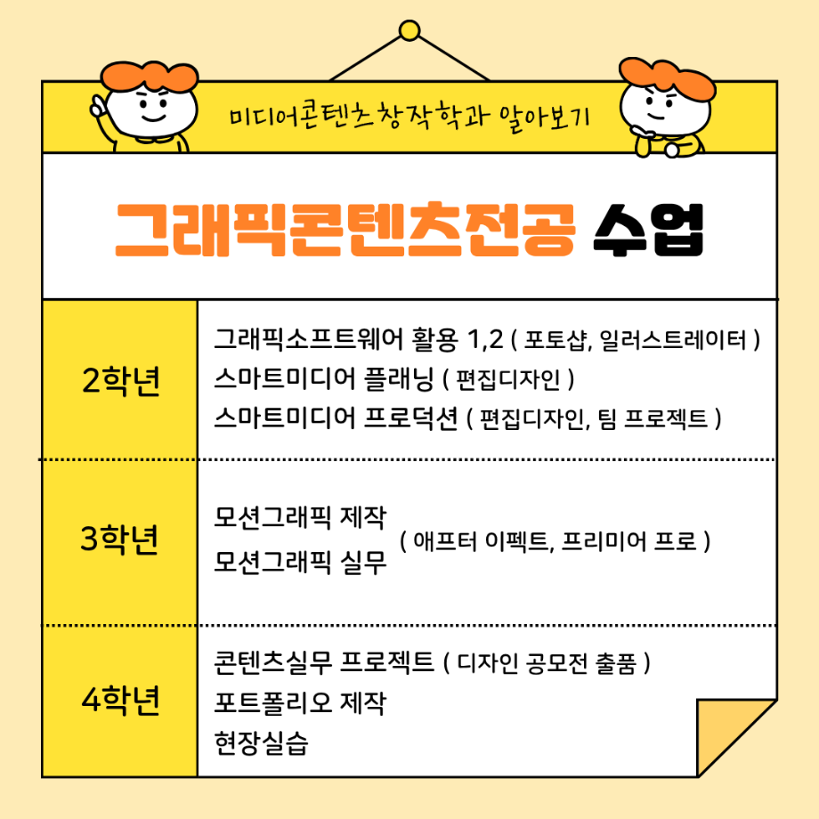 본문 시작 홈으로 MCC News 학과소개 교수소개 학과과정 MCC News MCC SNS 홈페이지가이드 미디어 정보통 학과 및 재학생 교수 및 졸업생 미디어 정보통 미디어 정보통 페이스북 트위터 프린트 🎨 미디어콘텐츠창작학과 | 그래픽 전공 미디어콘텐츠창작학과 732 2025-09-10 그래픽 전공에서는 디자인의 기초부터 디지털 콘텐츠 제작까지 실무에 필요한 다양한 시각 표현 기술을 배웁니다. 학생들은 직접 작업물을 만들며 디자이너, 영상 그래픽 전문가, 콘텐츠 크리에이터로 성장할 수 있습니다. 목록 이전백억커피 x 곰믹스 AI 활용 영상 공모전 다음 2025학년도 2학기 원어민 교수와의 대화 담당부서 : 미디어콘텐츠창작학과 담당자 : - 연락처 : 043-649-1741 최종수정일 : 2024-10-26 만족도조사 만족도 조사 이 페이지에서 제공하는 정보에 대하여 만족하시나요? 매우만족 만족 보통 불만족 매우불만족