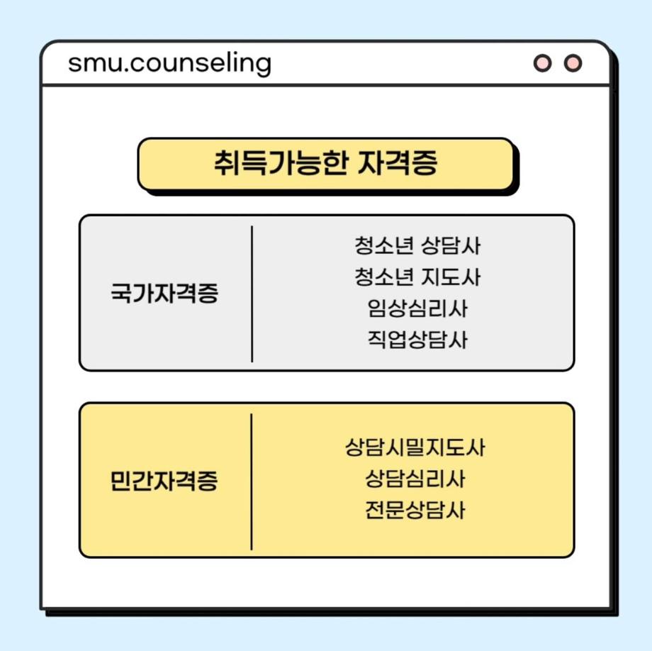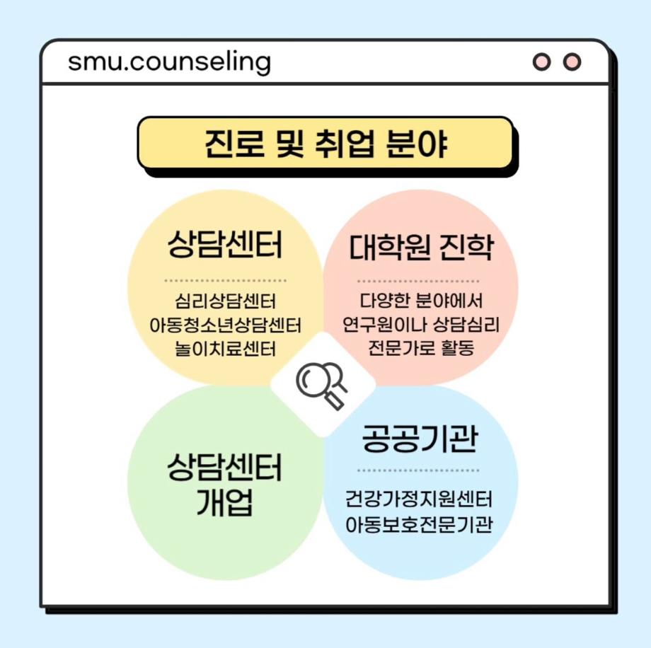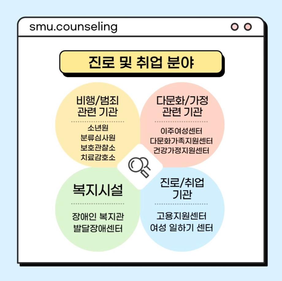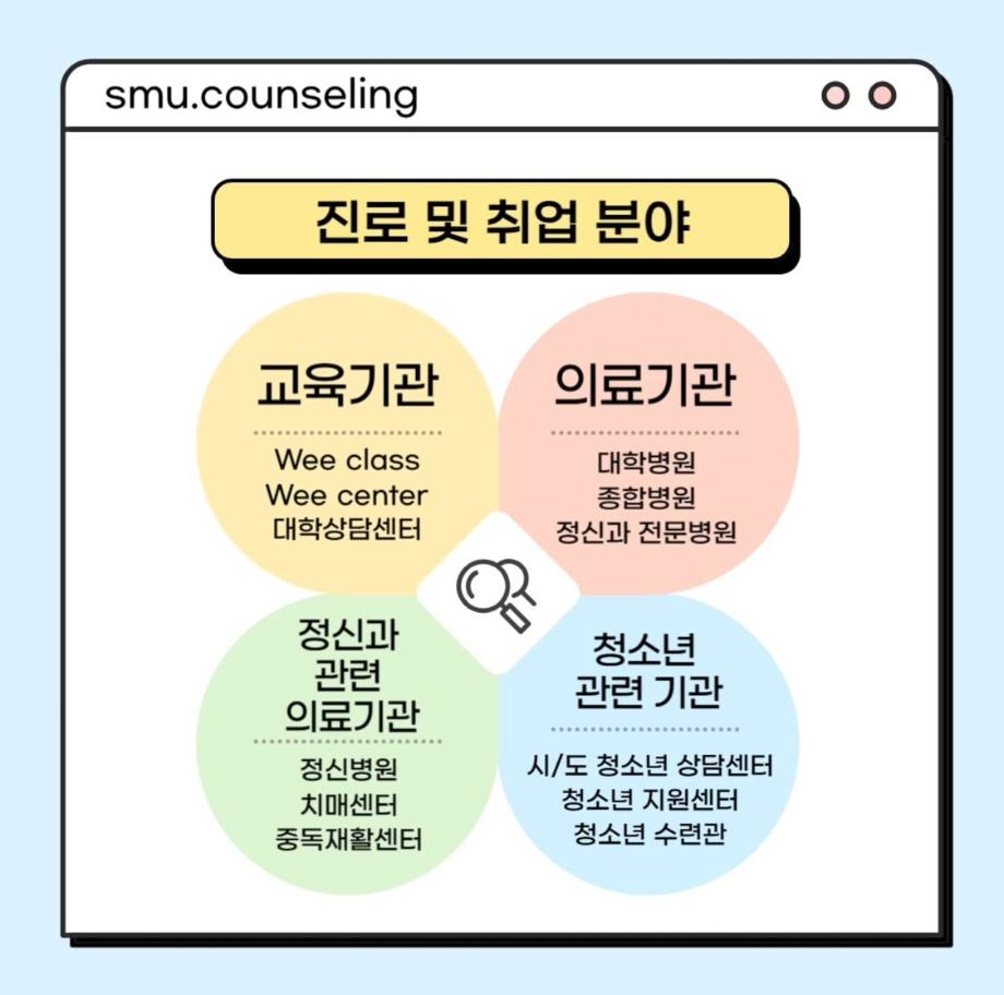 본문 시작 홈으로 학과 커뮤니티 학부소개 교수소개 교육목표 입학안내 학과 커뮤니티 대학원 커뮤니티 홈페이지가이드 학과 갤러리 학과소식 학사일정 학과 갤러리 학과 갤러리 페이스북 트위터 프린트 자격증&진로 소개 상담심리학과 528 2025-07-30 안녕하십니까 세명대학교 상담심리학과입니다! 오늘은 상담사가 되기 위해 필요한 자격증, 취업 분야를 소개해드리려고 합니다. 상담심리학과 졸업 후에는 교육기관, 의료기관, 복지시설 등 다양한 분야에서 활동할 수 있습니다 :) 목록 이전[현직자 인터뷰] 평창군청소년상담복지센터 다음 [현직자 인터뷰] 육군 상담사 만족도조사 만족도 조사 이 페이지에서 제공하는 정보에 대하여 만족하시나요? 매우만족 만족 보통 불만족 매우불만족