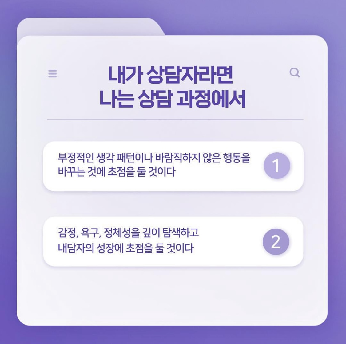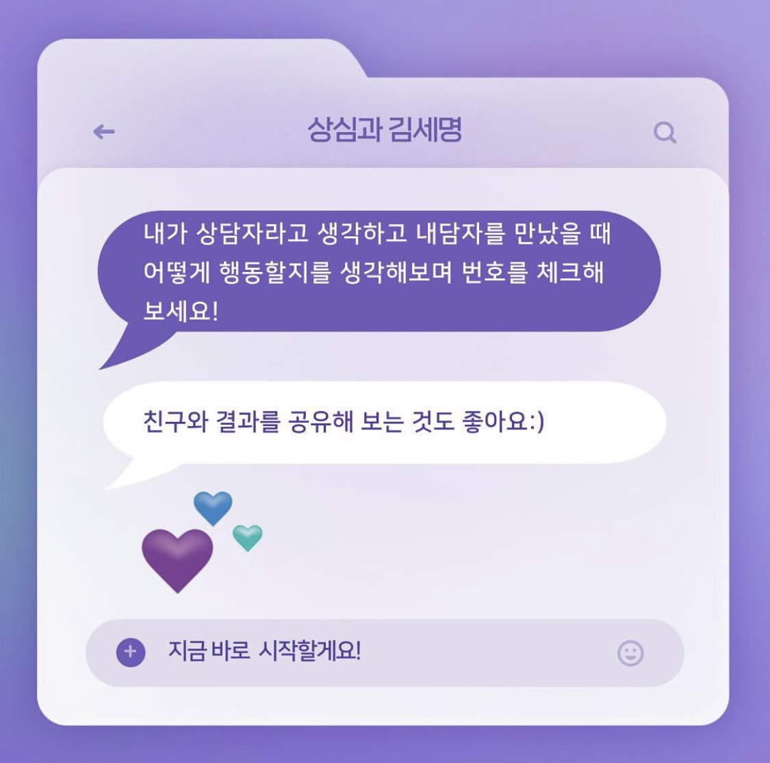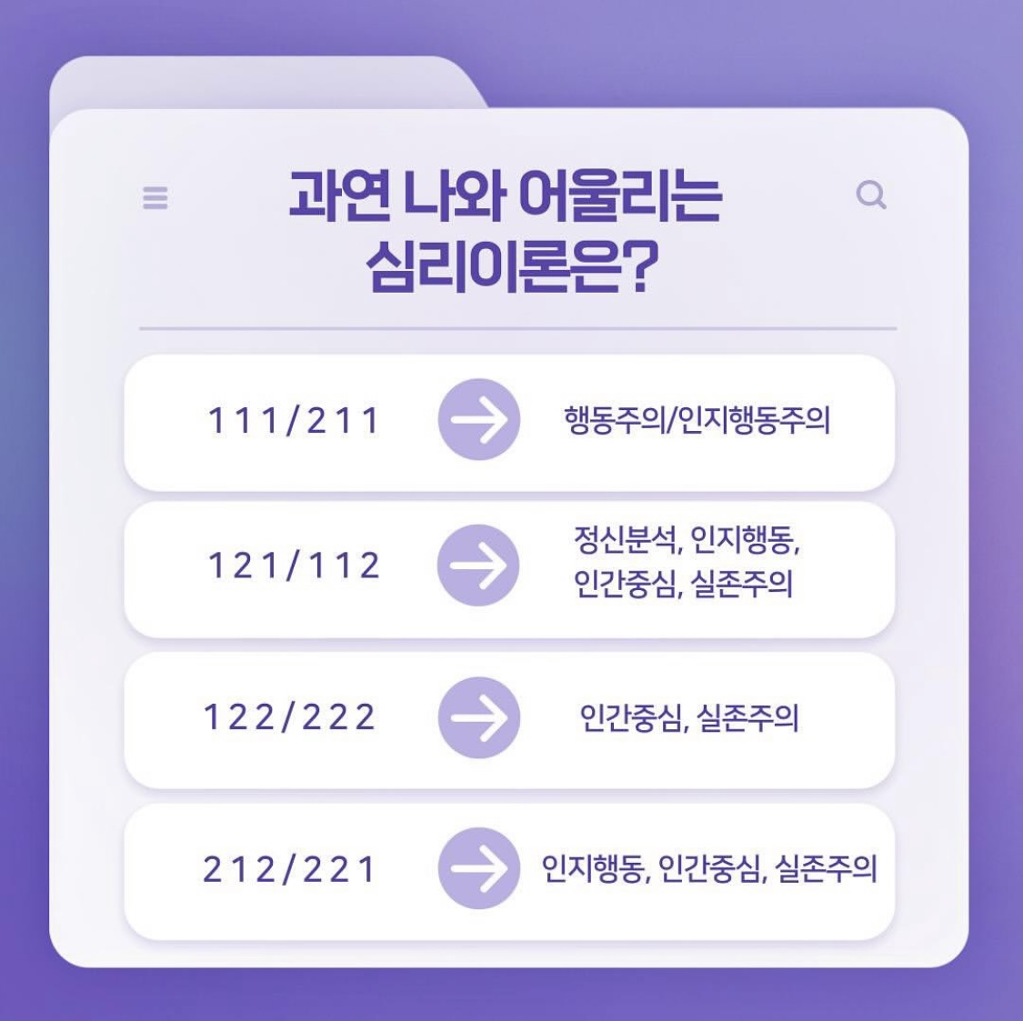 본문 시작 홈으로 학과 커뮤니티 학부소개 교수소개 교육목표 입학안내 학과 커뮤니티 대학원 커뮤니티 홈페이지가이드 학과 갤러리 학과소식 학사일정 학과 갤러리 학과 갤러리 페이스북 트위터 프린트 나와 어울리는 심리이론은? 상담심리학과 216 2025-11-18 안녕하세요 세명대학교 상담심리학과입니다! 오늘은 나와 어울리는 심리이론 테스트를 준비했습니다 :) 딱 1분! 나와 어울리는 심리이론 찾기! 가볍게 골라보는 심리 취향 테스트 친구와 함께 공유 해보는 것은 어떨까요? 목록 이전동물매개치료 전공특강 다음 2025학년도 2학기 현장견학 만족도조사 만족도 조사 이 페이지에서 제공하는 정보에 대하여 만족하시나요? 매우만족 만족 보통 불만족 매우불만족