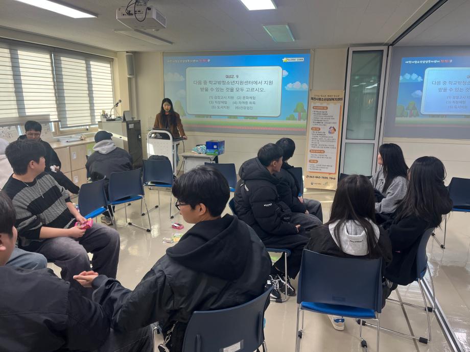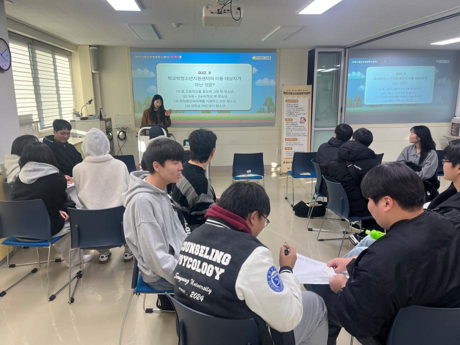 본문 시작 홈으로 학과 커뮤니티 학부소개 교수소개 교육목표 입학안내 학과 커뮤니티 대학원 커뮤니티 홈페이지가이드 학과 갤러리 학과소식 학사일정 학과 갤러리 학과 갤러리 페이스북 트위터 프린트 2025학년도 2학기 현장견학 상담심리학과 246 2025-11-20 안녕하세요 세명대학교 상담심리학과입니다! 지난 3일 상담심리학과 1, 2학년 학생들은 제천시청소년상담복지센터로 현장견학을 떠났습니다! 센터 견학과 퀴즈 프로그램을 통해 상담복지센터에 대해 알 수 있는 뜻깊은 시간이 됐습니다. 오늘의 견학이 앞으로의 진로에 도움이 되고 결정할 수 있는 데에 필요한 시간이 되었으면 합니다 :) 목록 이전나와 어울리는 심리이론은? 다음 12월 학사일정 만족도조사 만족도 조사 이 페이지에서 제공하는 정보에 대하여 만족하시나요? 매우만족 만족 보통 불만족 매우불만족